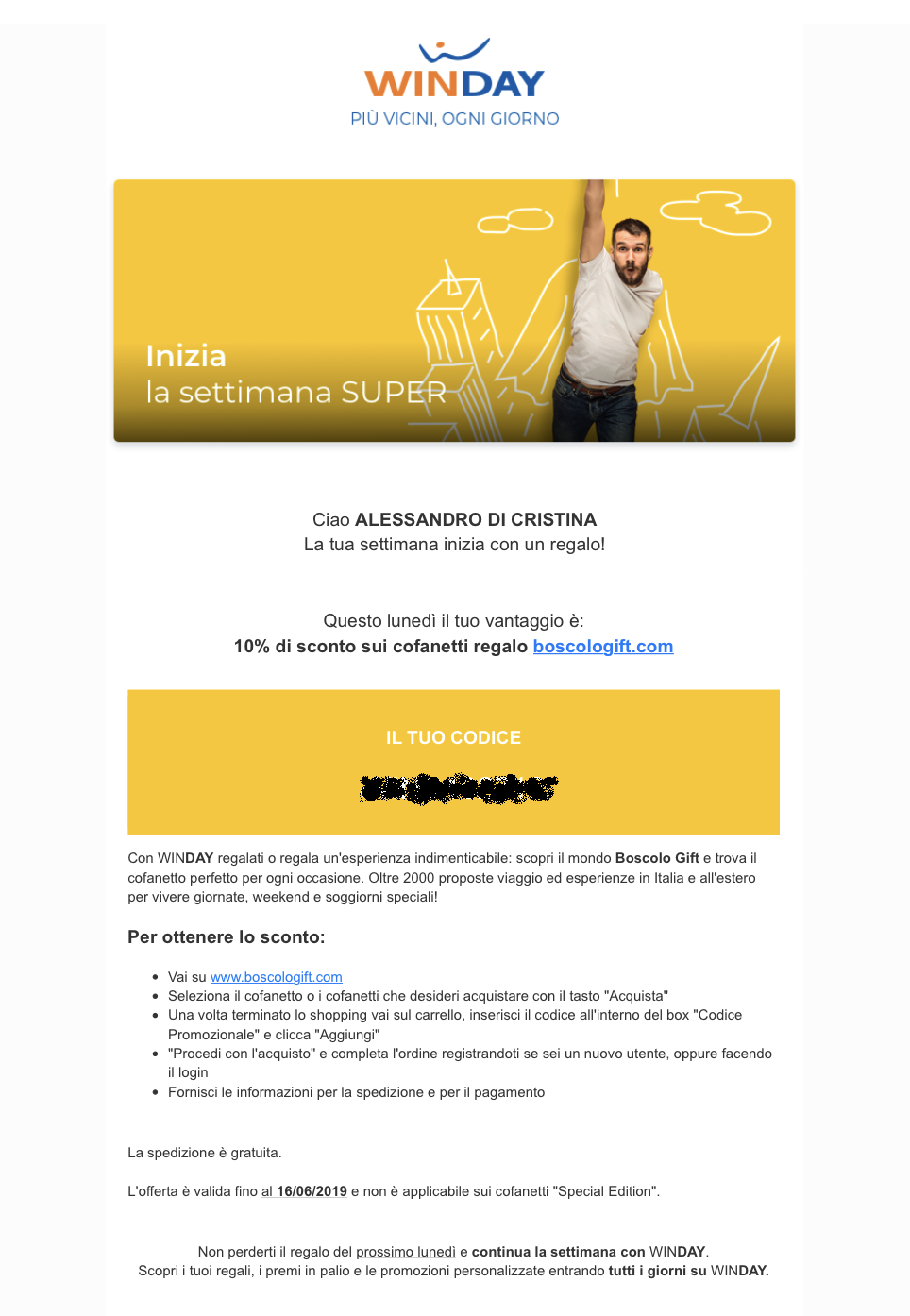 Al completamento della richiesta l’utente riceverà una mail di conferma contenente il codice per ricevere lo sconto e le istruzioni su come sfruttarlo.