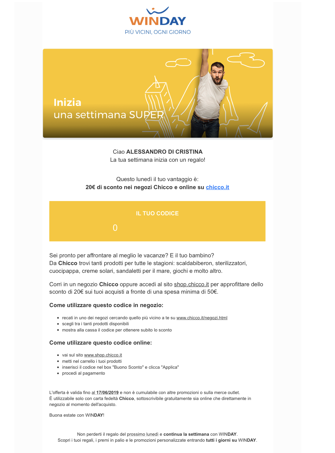 Il Winday di oggi, Lunedì 3 Giugno, regala agli iscritti al programma un buono sconto del valore di 20€ valido nei negozi Chicco e sul sito chicco.it, a fronte di una spesa minima di 50€.