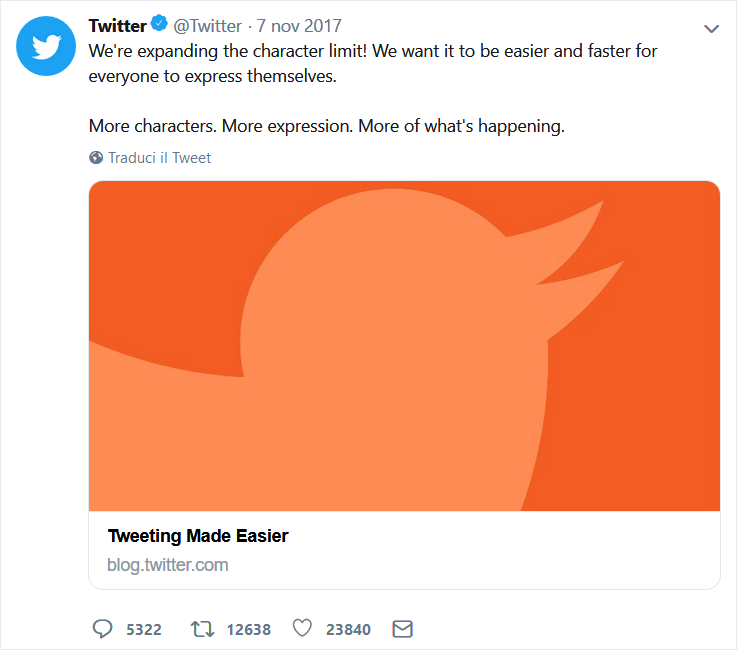 Andando avanti negli anni il social ha mantenuto questo limite fino al Novembre del 2017, quando la stessa Twitter ha “twittato” una novità enorme prevista per i giorni a seguire.