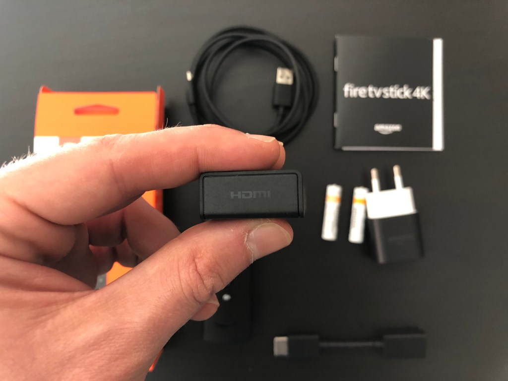 In confezione troviamo la Amazon Fire TV Stick 4K, il Telecomando con microfono e tasti dedicati ad Alexa, l’alimentatore con il cavo USB-microUSB, due pile AAA per il telecomando, la guida rapida, un piccolo “prolungo” HDMI-HDMI.