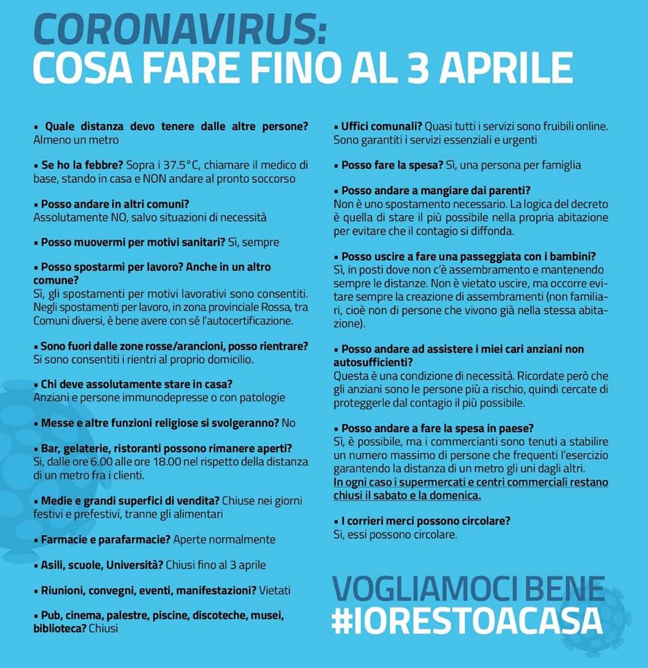 Ancora una volta ribadiamo che la cosa principale da adottare in questo momento è il buon senso, limitando gli spostamenti allo stretto necessario e cercando di sfruttare quanto più possibile gli strumenti messi a disposizione dalla tecnologia.