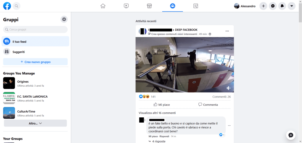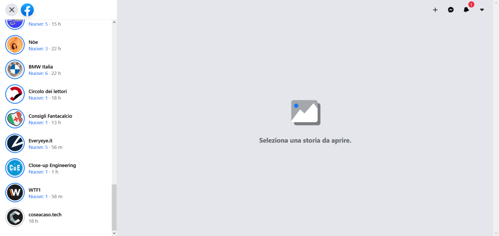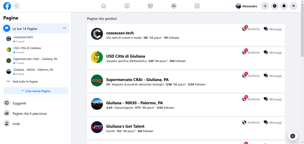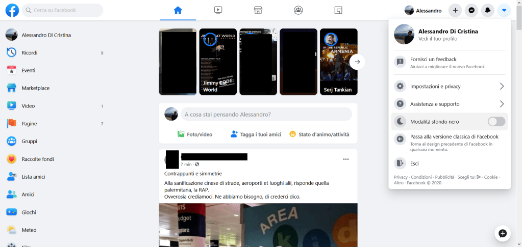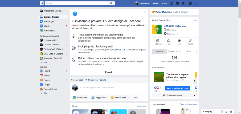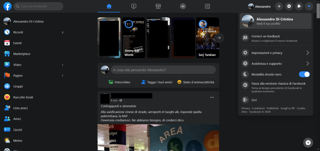 Nella barra in alto a sinistra c’è il logo di Facebook con il campo per la ricerca subito accanto. Nella parte destra c’è il nostro avatar circolare con il nome e quattro pulsanti: Crea (per creare pagine, gruppi, eventi, eccetera), Messenger (per aprire le chat), Notifiche e la Linguetta per le impostazioni e dalla quale sarà possibile cambiare l’aspetto da chiaro a scuro.