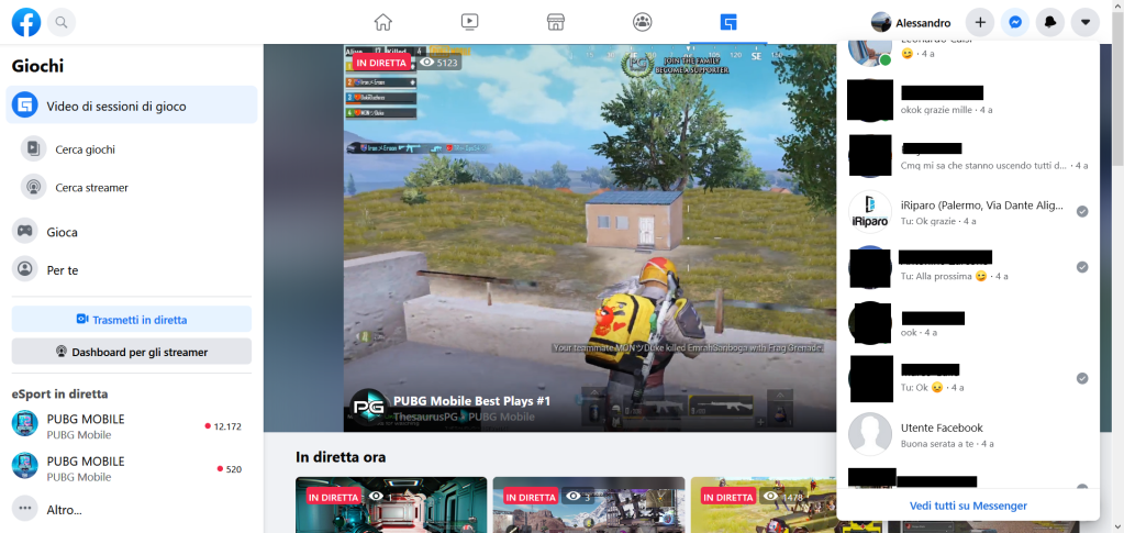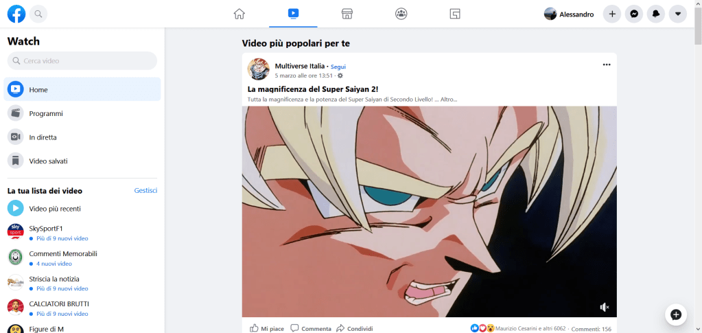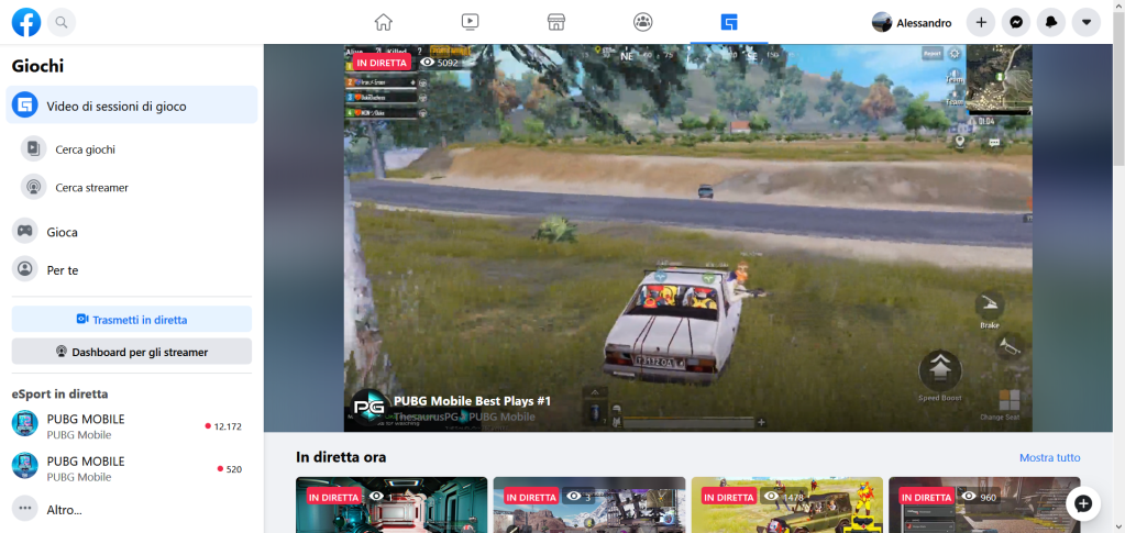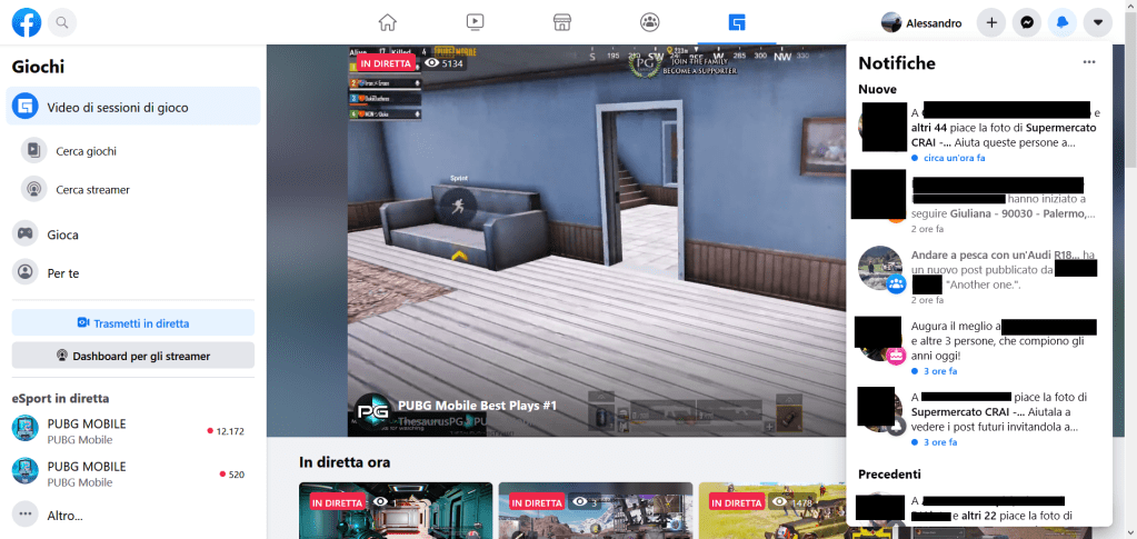 Nella parte centrale della barra in alto troviamo i 5 pulsanti relativi alle schede per navigare tra: Home, Facebook Watch, Marketplace, Gruppi e Facebook Gaming, piattaforma dedicata ai videogiochi.