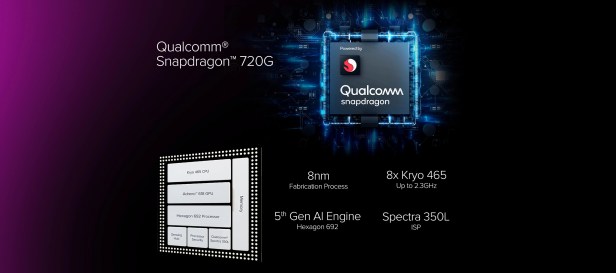 Il processore è il Qualcomm Snapdragon 720G, un’octa-core a 64-bit (processo produttivo a 8nm) con frequenza operativa massima di 2.0 GHz, abbinato alla GPU Adreno 618.