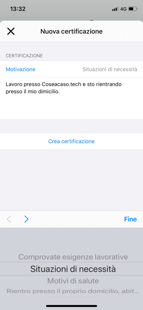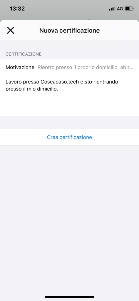 Successivamente, una volta inserita l’anagrafica, sarà possibile creare l’autocertificazione, scegliendo la motivazione e spiegando cosa si stia facendo.