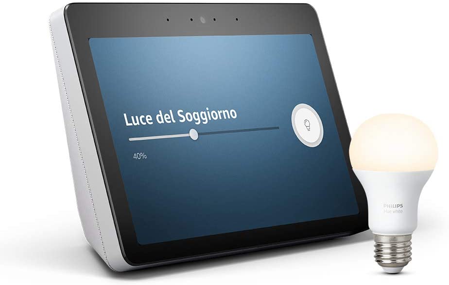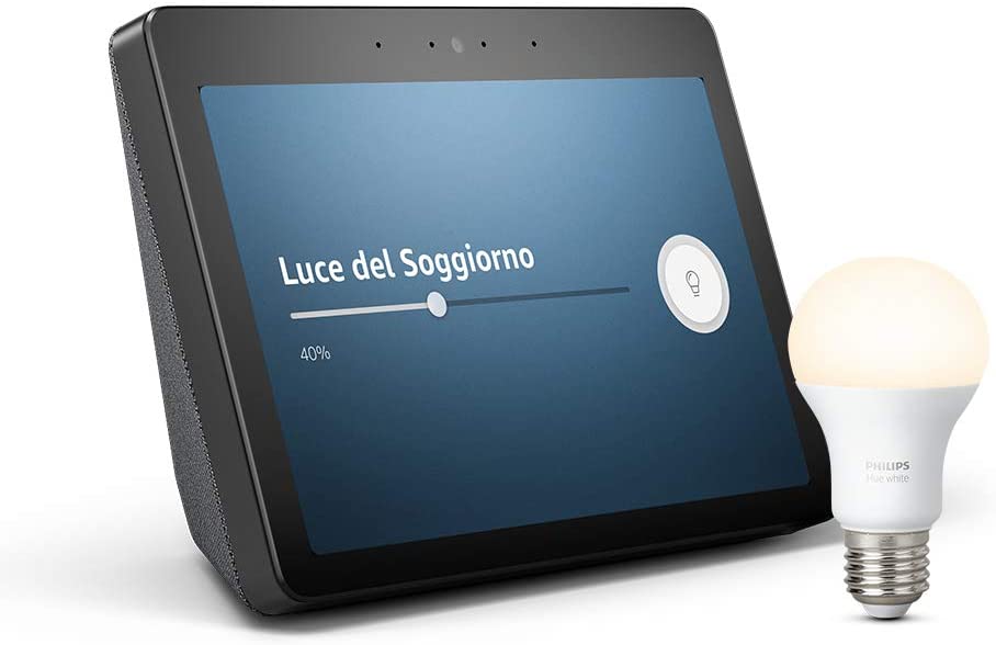 Si tratta di un bundle composto da Echo Show di seconda generazione e lampadina smart Philips Hue White.