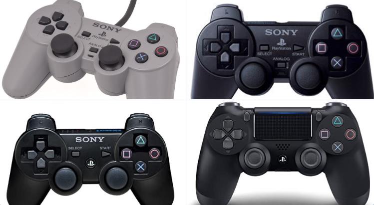 Il controller si configura in rottura col passato e il design appariscente si discosta abbastanza da quello delle generazioni precedenti (che vedete qui sotto: PS e PS2 nella fila in alto, PS3 e PS4 nella fila in basso).