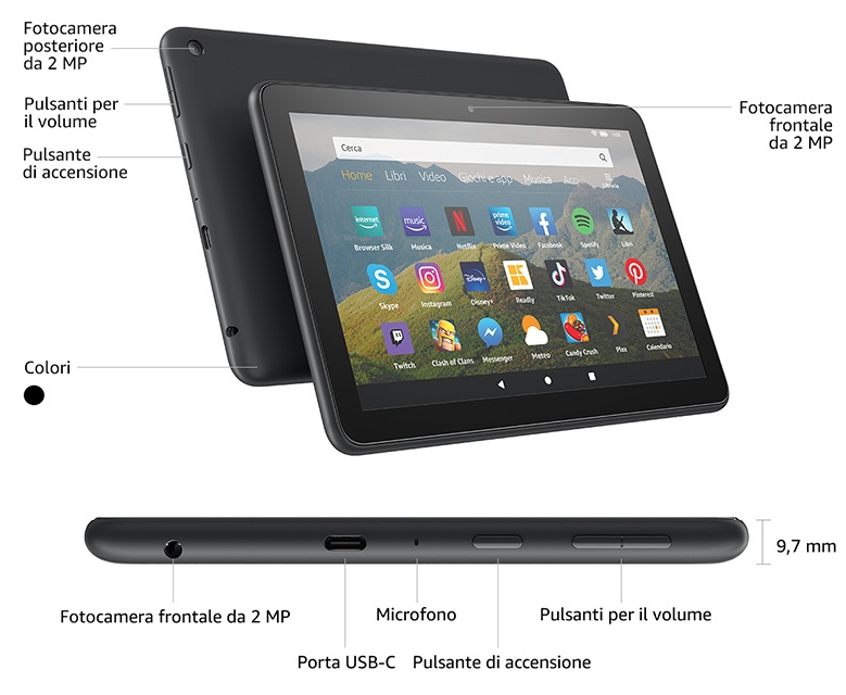In confezione saranno presenti, oltre al Fire HD 8, un cavo USB-C, un caricatore da 5W e la guida rapida all’uso.