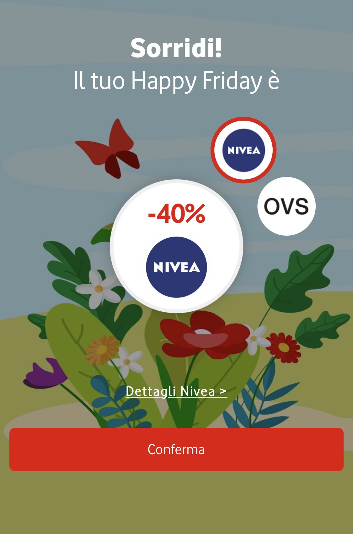 Oggi, Venerdì 15 Maggio, Vodafone Happy Friday ci mette davanti alla scelta tra due proposte: sconto del 40% su una selezione di prodotti Nivea o buono sconto di 10€ su OVS.