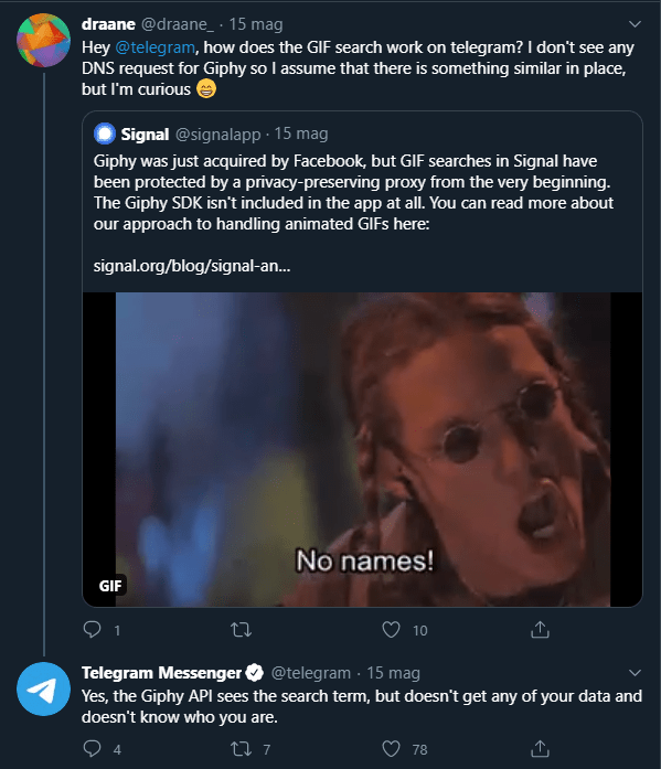 Prendo in particolare le dichiarazioni di Signal, coinvolta nel tweet citato precedentemente: