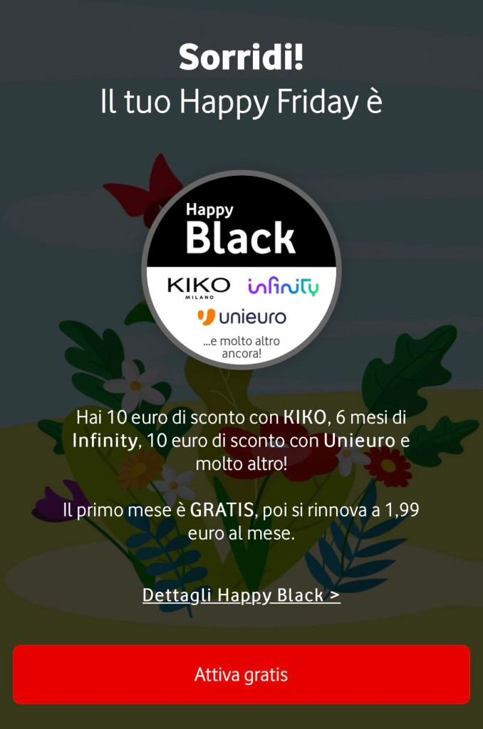Oggi, Venerdì 22 Maggio, Vodafone Happy Friday fa storcere il naso un po’ a tutti gli iscritti al programma, andando a proporre un mese gratis del programma Happy Black; dopo il mese gratuito, il costo è di 1.99€/mese.