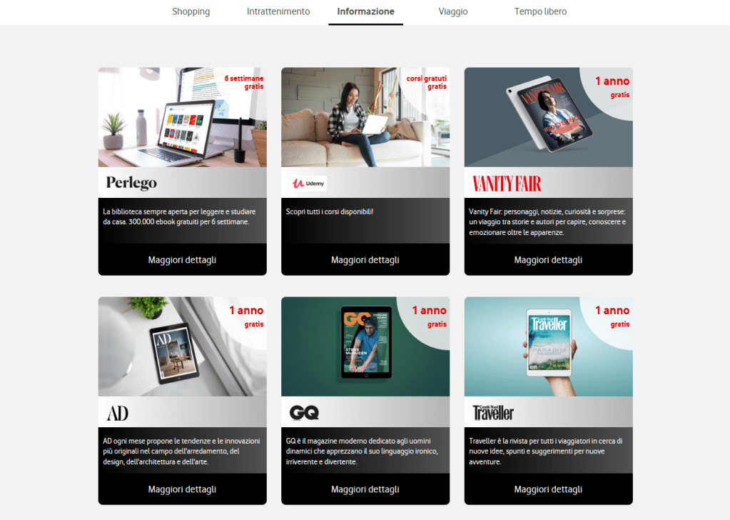 La tua passione sono i film e le serie TV? Con Happy Black hai 6 mesi di Infinity! Se preferisci ascoltare la musica, hai più di 60 milioni di brani e tante playlist con TIDAL Premium! Con Dplay Plus guarda i migliori contenuti di Discovery, in esclusiva e senza pubblicità! Resta informato e dedicati alla lettura con Corriere della Sera, Vogue e Wired.