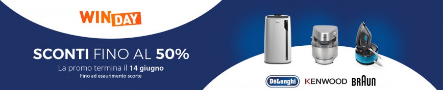 In regalo col WINLunedì di oggi, Lunedì 1 Giugno, offre SCONTI fino al 50% su una selezione di elettrodomestici De’Longhi, Kenwood e Braun sul sito di Livinshop, rivenditore ufficiale di De’Longhi.