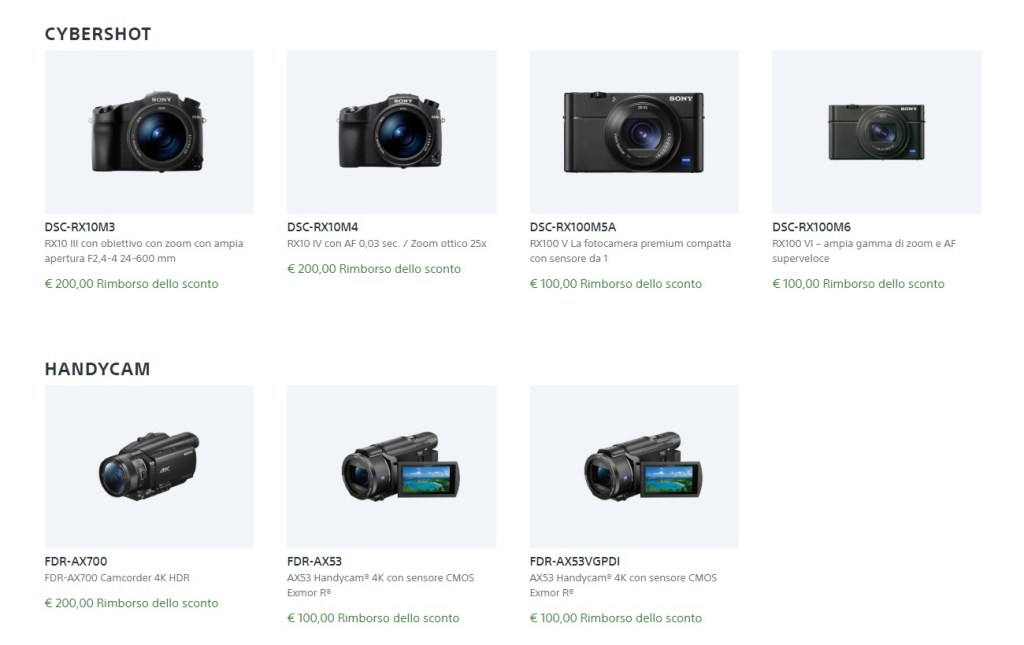 All’interno della promozione, troviamo alcuni modelli della serie Cybershot, alcuni modelli della serie Handycam, parecchi modelli della serie Alpha, ma anche tanti Obiettivi e Accessori (come flash e microfoni esterni o impugnature).